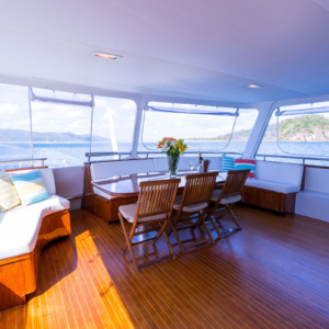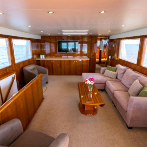 The main deck of the Rhemtide features an expansive saloon that serves as a versatile social hub. Whether you’re entertaining guests or seeking a space to relax in comfort, this area provides the perfect setting. Impeccable design and attention to detail create an ambiance of refined elegance and tranquility.